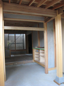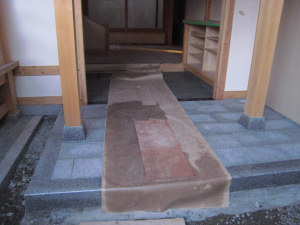 11月2日から玄関の靴箱や玄関石畳、 玄関中庭のガラス窓が整備されました。 きれいな左官工事です。 |