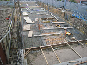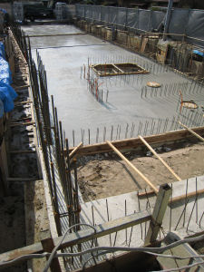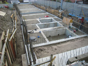 基礎部分がきれいに整地され、次は 地下部分の鉄筋を入れます。11月29日に コンクリートを搬入して固めます。これで、 基礎の上に地下部分が出来上がりました。 |