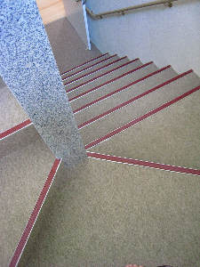 会館2階に続く階段も床にクロスが貼られて、 落ち着いた雰囲気になりました。 |
