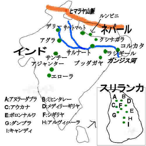 わたくし達の生きるよりどころである仏教は、人間ゴータマ・シッダールタの誕生にはじまる。 2500年前、シッダールタは真理をさとりブッダとよばれる。 さあ、そのブッダと遇いにインド・スリランカの旅に出かけましょう。 ※下の地図の緑の「●」をクリックしてください。